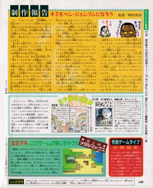 ![]() 7月号で紹介されたプレストーリーにおける三博士とは若干の変更。 「陰陽、文書、地理」という役割だったのが「魔法、生命・生物、からくり」という製品版に近づいた。 名前はまだ未決定らしい。 ![]() 7月号で行った敵キャラ公募の入賞作発表。 一等賞「砂金スライム」はゲーム内で「金のよだれ」として実装された。 入賞「惨憎法師」はデザインもネーミングもそのままお見事! もう一つの入賞「蛙丸(かえるまる)」はゲーム内で「かわず丸」として実装された。 特別賞「ナマコンダ」は……ナマコの体にオバタリアンの顔というメチャクチャさを評価とあるが、 もしかして「軟体仮面」の元なのだろうか? 今回の公募は「『天外II』100のQ」。天外2への疑問や質問を100個募集している。 原作:広井、監督:桝田、演出:岩崎、絵師:辻野の誰に尋ねたいのかを明記してくれという事だが、 この募集結果が発表された様子が無い……100個集まらなかったのだろうか。 <お毒見チャートでの岩崎氏のコメント> ついに、ついに『天外2』のシナリオの第1稿が上がり、プログラムを、いよいよ始めようとしているのだ。さあ忙しいぞぉ。 <発売スケジュール> 発売日価格未定、CD-ROM |